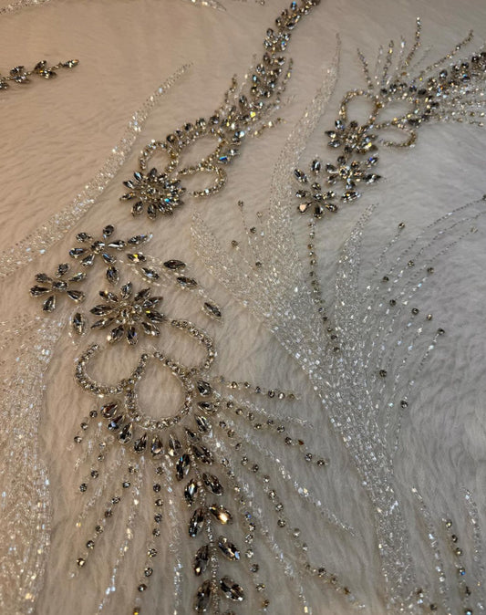 Ivory Elegance: Handcrafted Crystal-Embellished Tulle Fabric for Timeless Couture