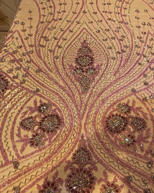 Luxurious Rose Pink and Silver Rhinestone Embroidery Fabric for Elegant Couture