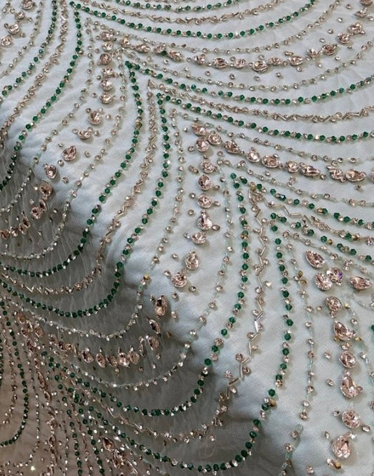Exquisite Green and Gold Rhinestone Embroidered Fabric – Handcrafted Luxury for Bridal & Couture Designs