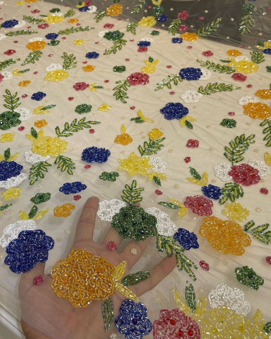 Vibrant Blossom Elegance: Handcrafted Multicolor Beaded Floral Fabric on Sheer Tulle for Luxe Couture