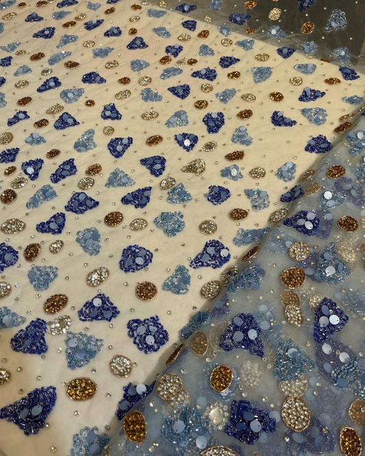 Golden Glow Embroidery: Hand-Embellished Net Fabric with Sequins, Beads, and Rhinestones