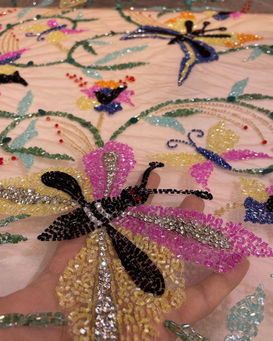 Butterfly Elegance: Hand-Beaded Butterfly and Floral Fabric on Light Beige Mesh for Luxe Couture Creations