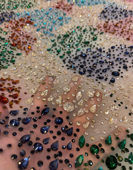 Luxurious Handcrafted Gradient Rhinestone and Bead Embroidered Tulle Fabric β Vibrant Greens, Yellows, Pinks, and Clear Crystal Accents for Bridal Dresses