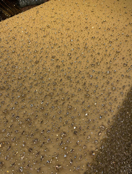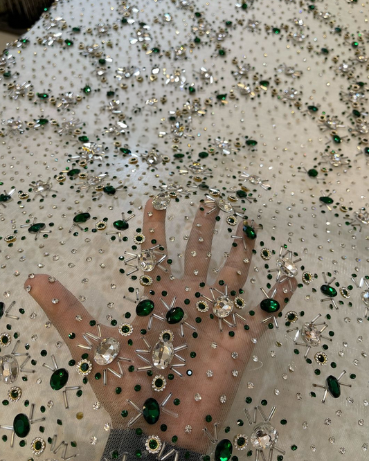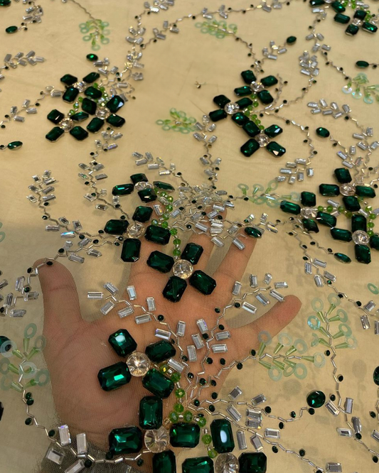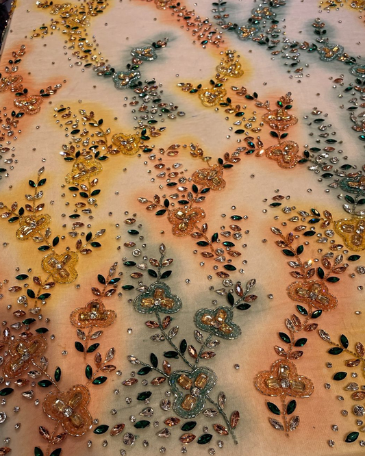 Luxurious Handcrafted Rhinestone and Bead Embroidery Fabric β Available in Ivory, Gold, and Mint Green