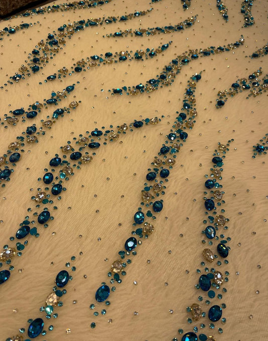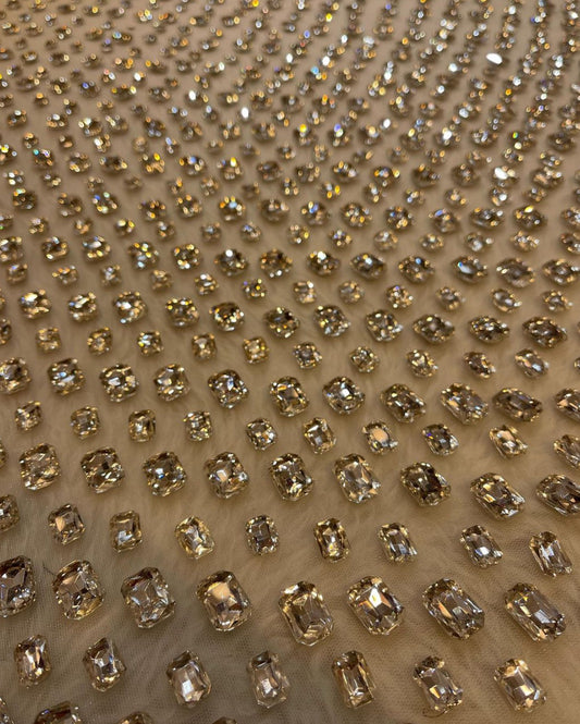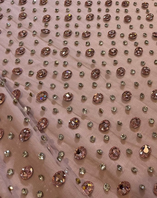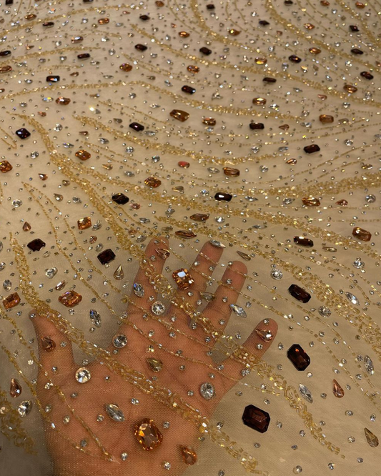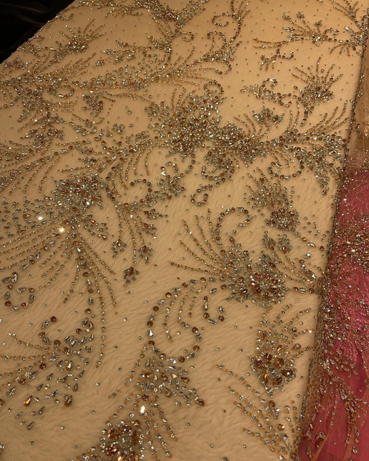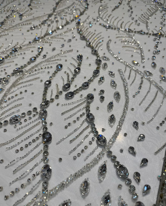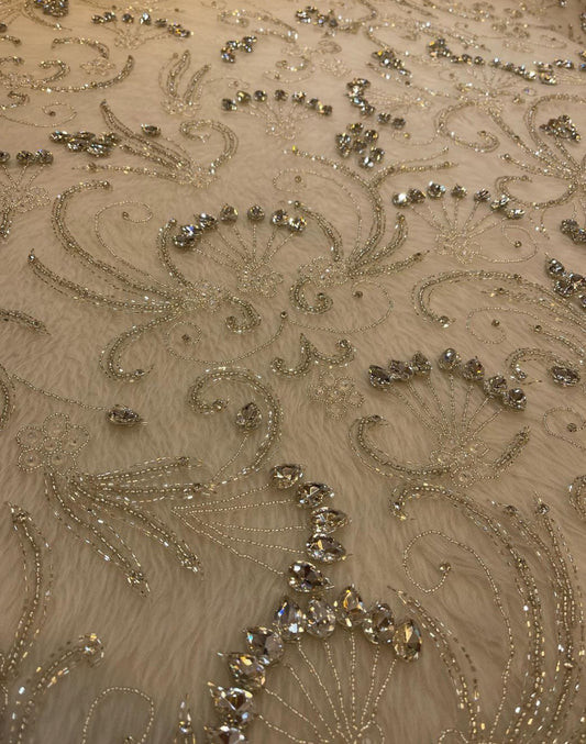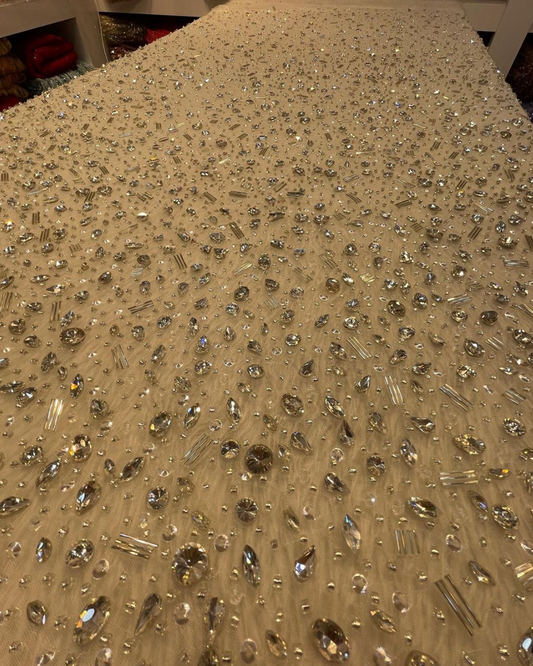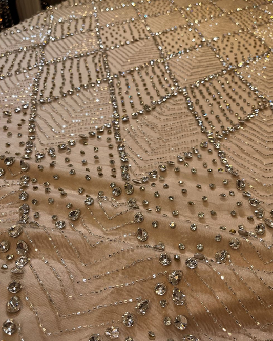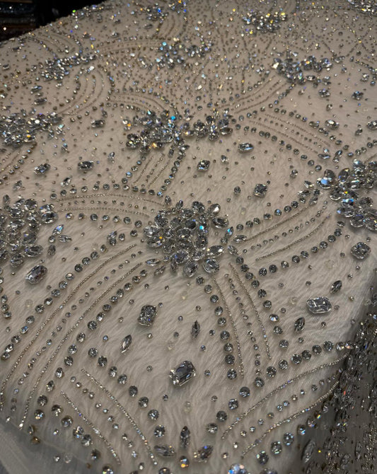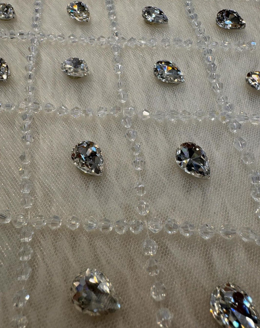 Ivory Elegance: Handcrafted Crystal-Embellished Tulle Fabric for Timeless Couture