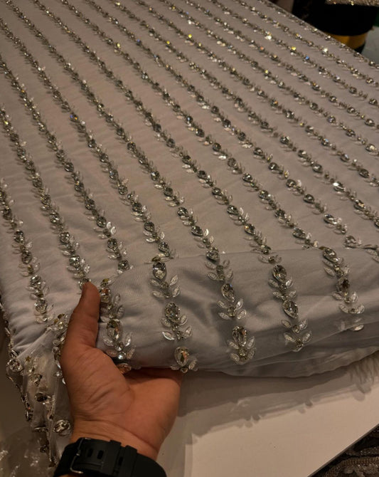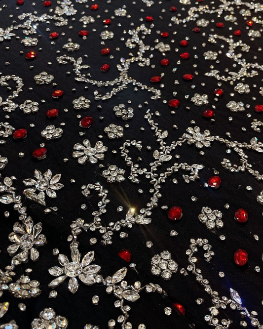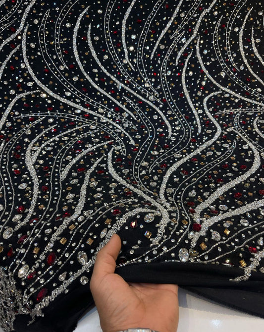 Handcrafted Luxurious Rhinestone and Bead Embroidery Fabric β Available in Black and White Variants
