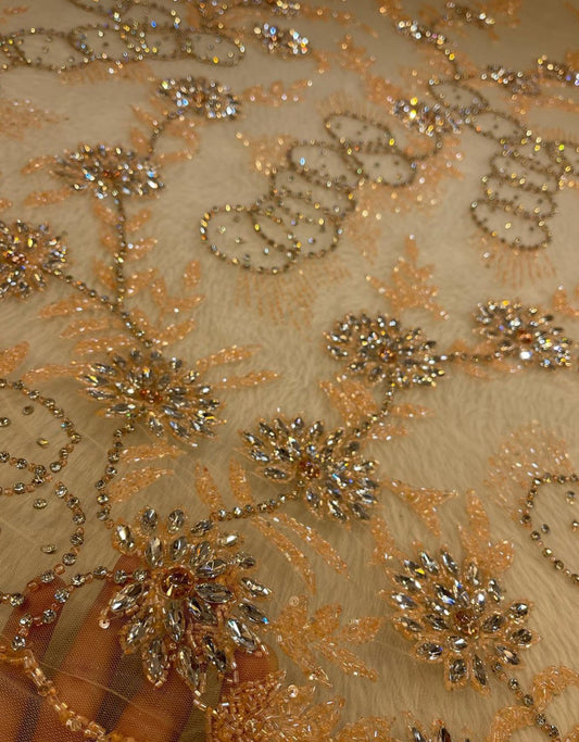 Luxurious Handcrafted Gold & Clear Rhinestone Embroidery Fabric β Elegant Botanical Design with Opulent Beadwork for Couture Fashion