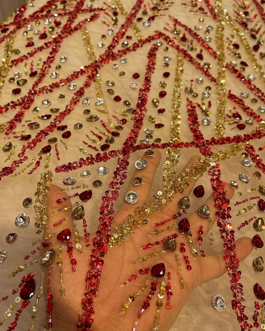 Handcrafted Luxury Embroidered Fabric β Art Deco Elegance in Golden, Red, and Green Variants