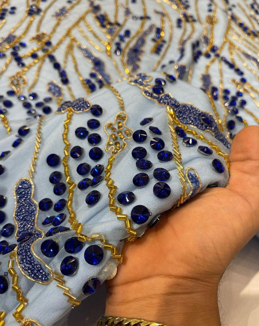 Luxurious Handcrafted Embroidered Fabric β Dynamic Gold & Blue Design with Silver & Purple Options
