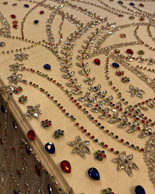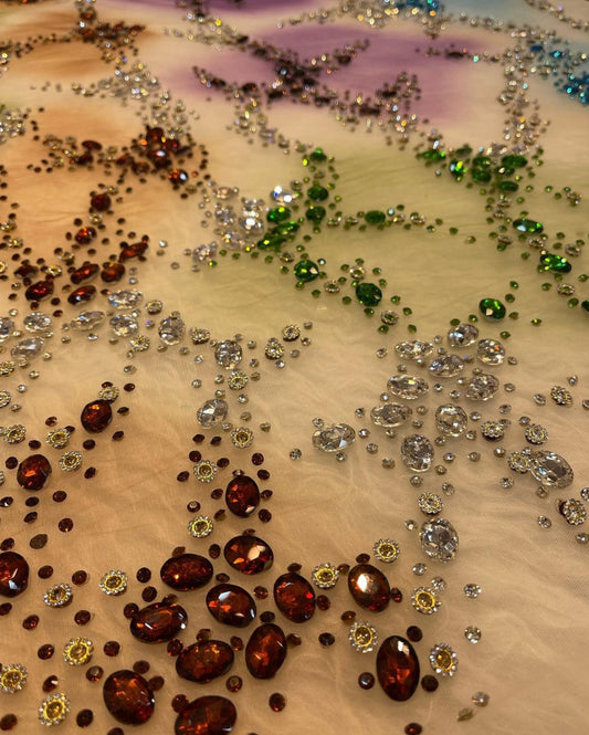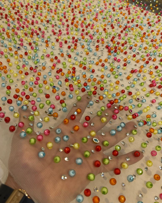 Symphony of Colors: Handcrafted Fabric Adorned with Vibrant Beads and Radiant Rhinestones