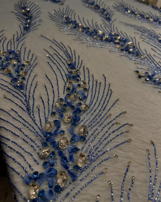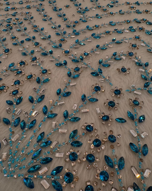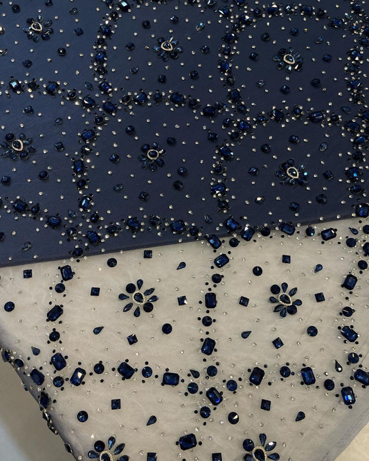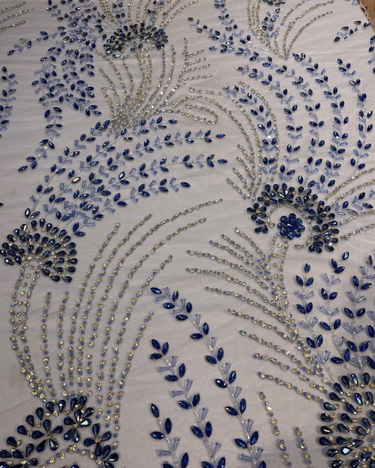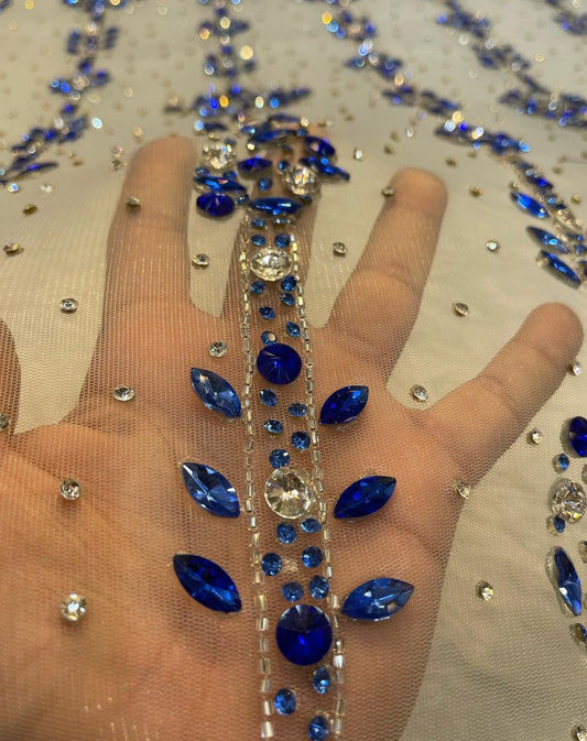 Royal Sapphire Elegance: Handcrafted Blue Rhinestone and Bead Fabric