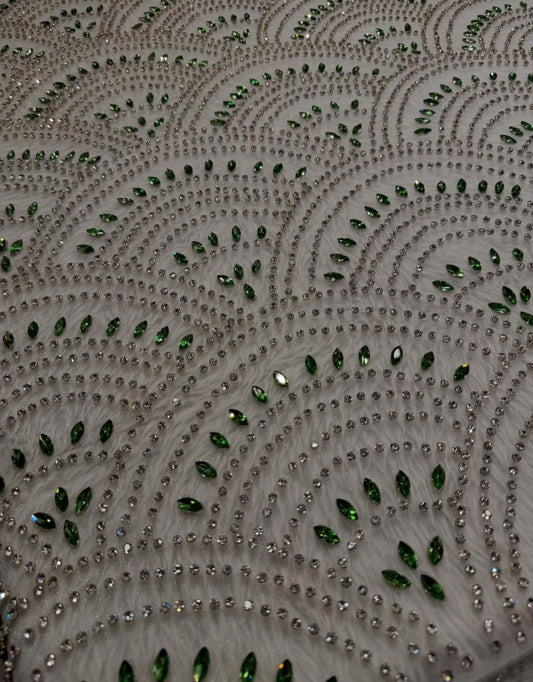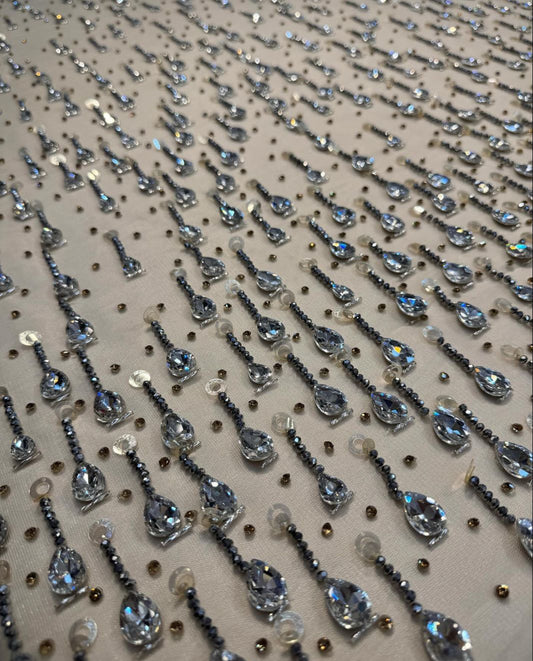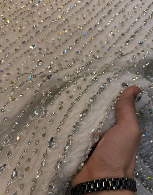 Timeless Elegance: Handcrafted Linear Embroidered Fabric with Shimmering Rhinestones