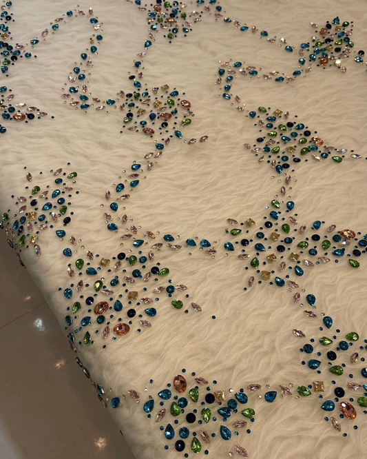 Vibrant Opulence: Handcrafted Rhinestone & Bead Embroidery on Ivory