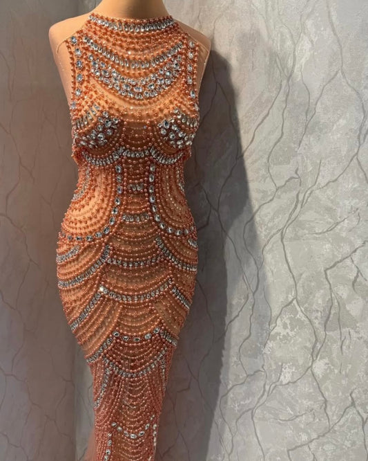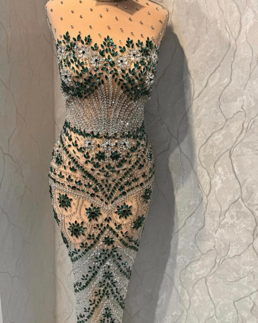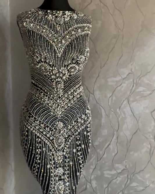 Ethereal Radiance: Handcrafted Crystal and Bead Embellished Evening Gown
