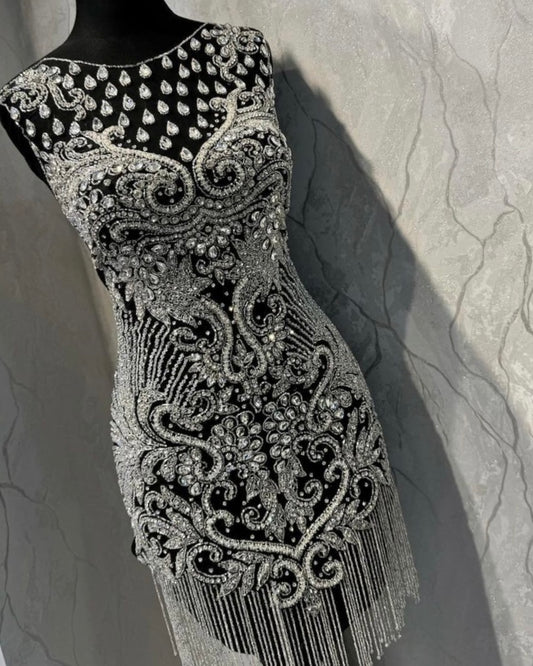 Ornate Crystal Beaded Mini Dress with Fringe Hem β Red, Black, or Nude